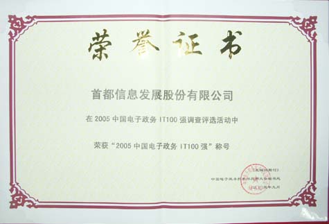 近日,公司再次荣获由《互联网周刊》和中国电子政务技术与应用大会秘书处联合颁发的“2005中国电子政务IT100强”荣誉证书,位列第20名。