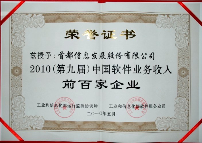 5月28日,余东辉总监出席在沈阳市丽都喜来登饭店举行的“2010中国软件业务收入前百家企业发布暨中国软件服务业骨干企业工作座谈会”。会上,公司被授予“2010(第九届)中国软件业务收入前百家企业”荣誉称号。