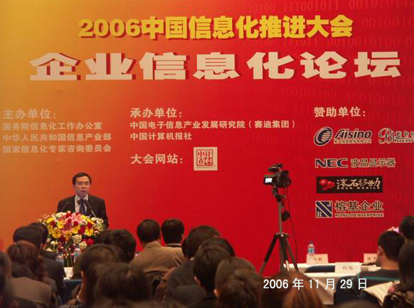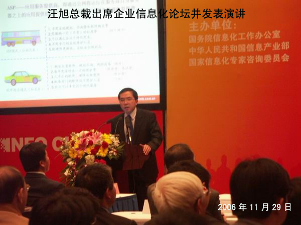11月29日,企业信息化论坛在北京国际会议中心举行。该论坛是“2006中国信息化推进大会”系列论坛之一,主题为“信息化领航中小企业”,由国务院信息化工作办公室推广应用组徐新国处长主持。国家发展和改革委员会中小企业司郑昕副司长、公司汪旭总裁、中国社会科学院信息化研究中心姜奇平秘书长、国家信息中心陈玉龙研究员、中国网络通信集团公司市场部黄庆霞副总经理、北京信用管理有限公司吴波总经理、IBM首席ERP顾问冯国华先生、《中小企业商务周刊》张巍主编等出席论坛并发表演讲。汪旭总裁的演讲题目为《中小企业ASP服务平台》。