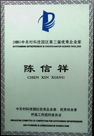 9月12日,陈信祥董事长出席在首都体育馆举行的“中关村第八届电脑节特别晚会暨中关村科技园区第三届双优评选颁奖晚会”,获“2005中关村科技园区第三届优秀企业家”荣誉证书。