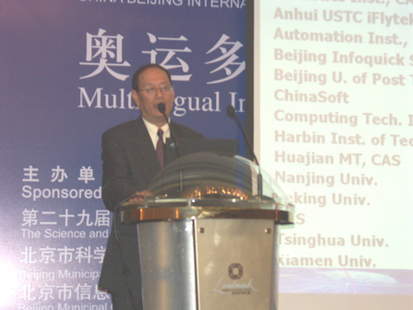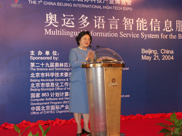 奥科委已将“面向奥运的多语言智能信息服务网络系统”项目列为科技奥运十大专项之一,国家“863”计划和北京市科技计划也分别将其列为重大研究项目。过去两年,中国国内20多个优秀的大学、研究院所和相关企业参与攻关,已经取得若干重要的阶段性成果和令人鼓舞的进展。她衷心希望通过此次论坛,通过与国外同行的深入交流,建立起更加广泛的国际合作,使该项目获得圆满成功。