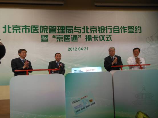 4月21日,为方便我市非医保患者及外地来京患者看病就医的“京医通”服务项目在北京友谊医院率先启动。北京市医管局局长方来英、北京银行董事长闫冰竹、友谊医院院长刘建、首信公司董事长徐哲共同为“京医通”卡揭卡。首信公司总裁汪旭、副总裁郑志广以及市卫生局有关代表、北京市数十家医院院长和北京银行各支行行长参加了揭卡仪式。