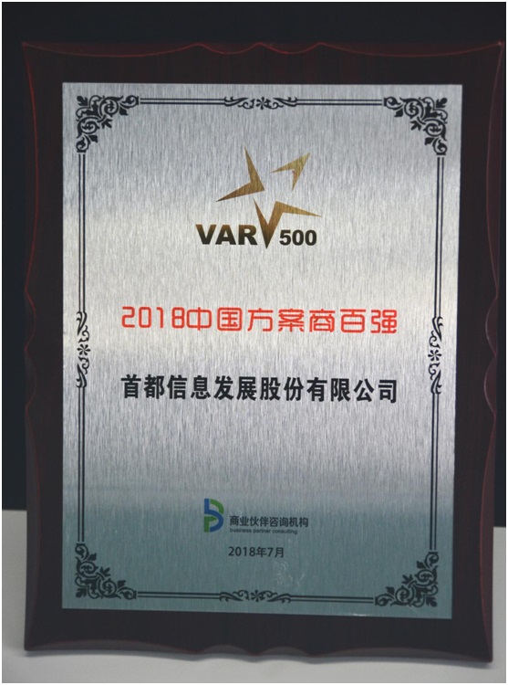7月26日,2018中国IT生态大会在北京中关村软件园举行,2018“中国方案商500强(VAR500)”榜单在大会上揭晓。首都信息发展股份有限公司(以下简称:首都信息)凭借稳定的营业收入,及应用软件开发、IT服务的综合实力,与中软国际、软通动力、神州数码等知名IT企业一同位列榜单前一百名,被授予“中国方案商百强企业”称号。