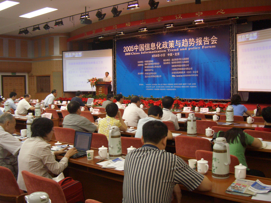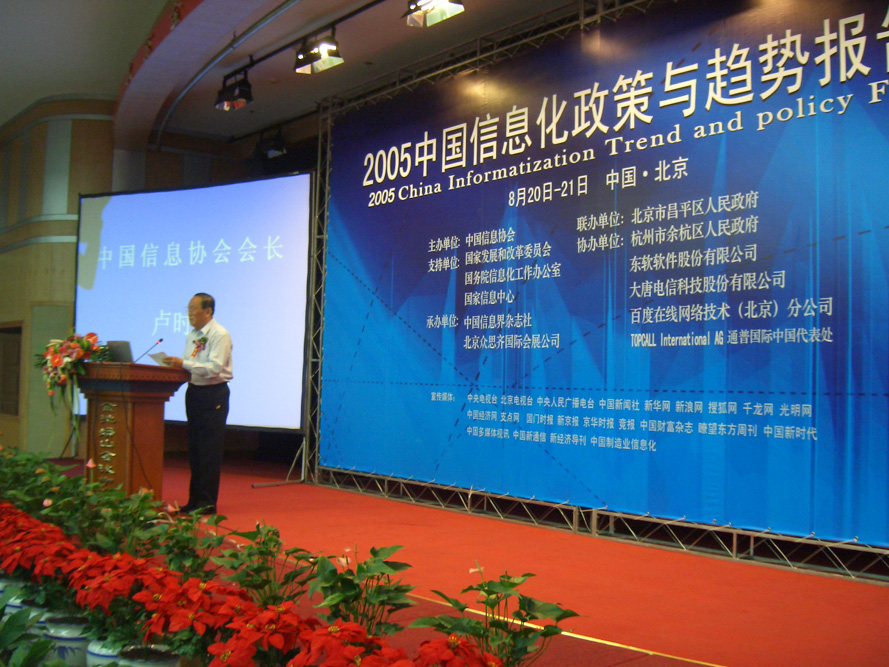 8月20~21日,汪旭总裁参加在北京金池蟒山会议中心举行的 “2005中国信息化政策与趋势报告会”。会议由中国信息协会主办,北京市昌平区人民政府联办,中国信息协会卢时彻会长主持。国家发展和改革委员会朱之鑫副主任,国务院信息化工作办公室杨学山副主任,国家信息化专家咨询委员会周宏仁常务副主任等出席会议,并就国家“十一五”信息化专项规划要点、国家信息化发展战略要点、信息化与新形势下的跨越式发展等内容做专题演讲。