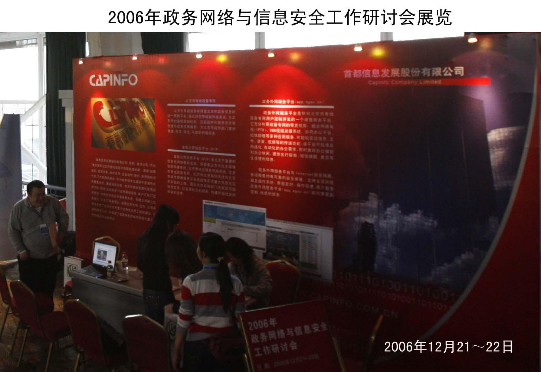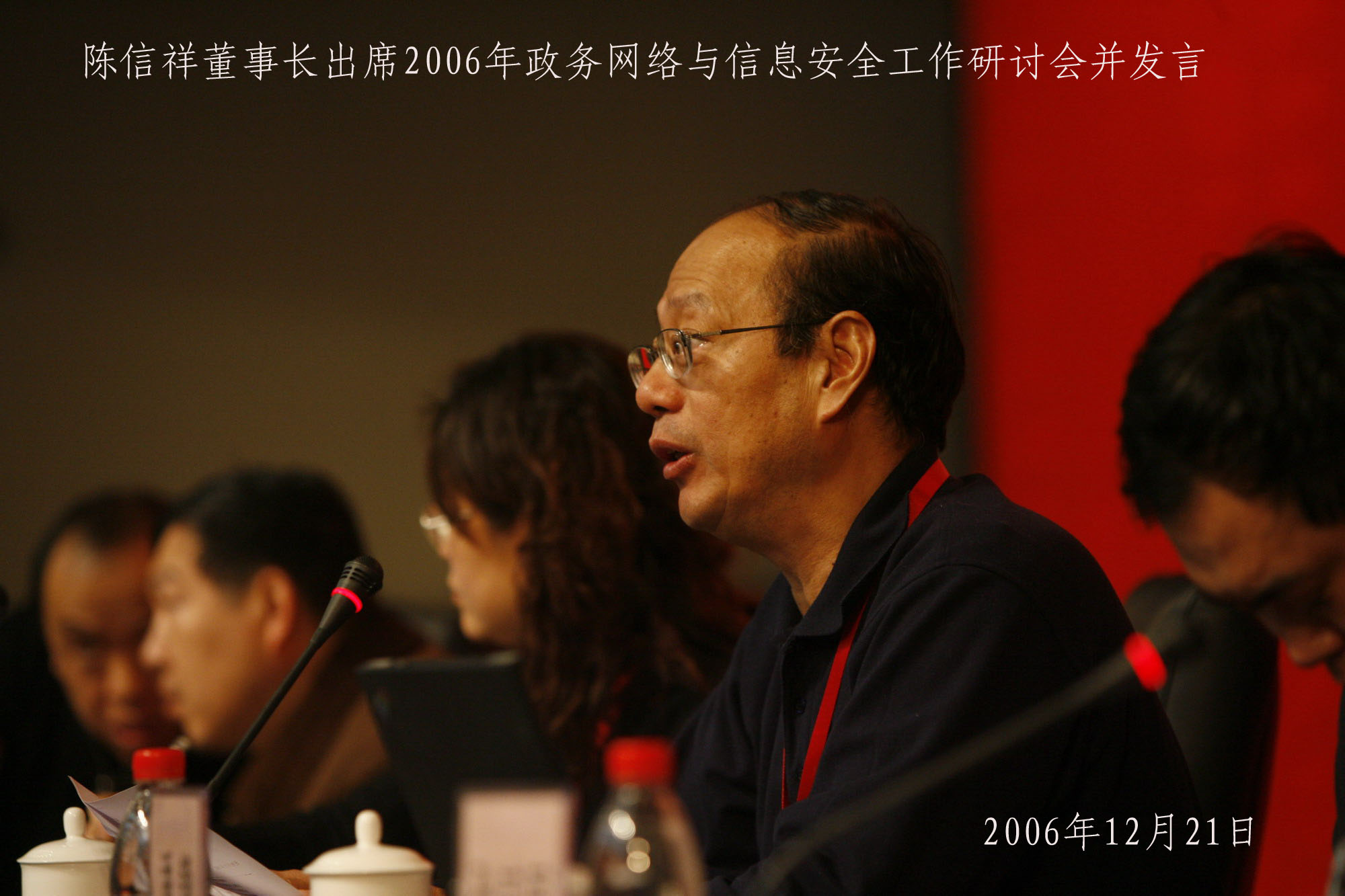 12月21~22日,陈信祥董事长出席在中信国安第一城举行的2006年政务网络与信息安全工作研讨会并发言。会议期间,公司展示了政务外网服务平台等成果。