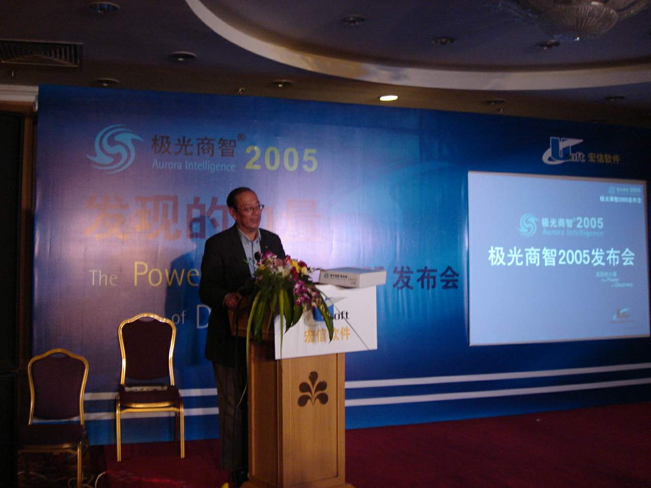 11月25日,陈信祥董事长、汪旭总裁在北京新世纪日航饭店二楼江苏厅出席宏信公司举办的“极光商智2005发布会”。