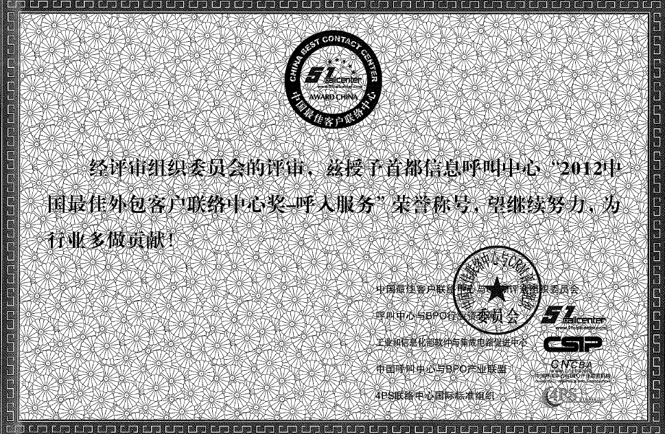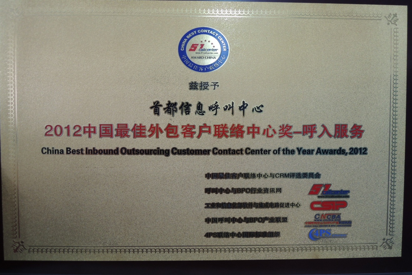 中国最佳客户联络中心与CRM评选组织委员会于9月21日在福建省宁德市举办了“2012中国最佳客户联络中心与CRM颁奖典礼”,宁德市市委书记廖小军、市长郑新聪,福建省发改委、经贸委、外经贸厅、信息化局等相关领导参加了颁奖活动。此次评选活动分为初审、复审和入户测评三个阶段,最终首都信息呼叫中心获得了“2012中国最佳外包客户联络中心奖-呼入服务”荣誉称号。