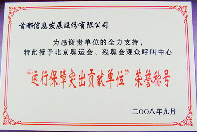 9月22日,公司荣获北京奥组委授予的北京奥运会、残奥会观众呼叫中心“运行保障突出贡献单位”荣誉称号。在北京奥运会、残奥会期间,公司奥运多语言综合信息服务系统向奥运观众呼叫中心(12308)提供了超过200万字、11个语种的奥运和城市信息。特别在奥运赛时,奥运多语言综合信息服务系统实时更新了3万余条、累计达55万字的奥运和城市信息,高质、高效的服务水平获得北京奥组委的好评和认可。