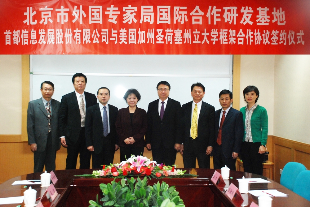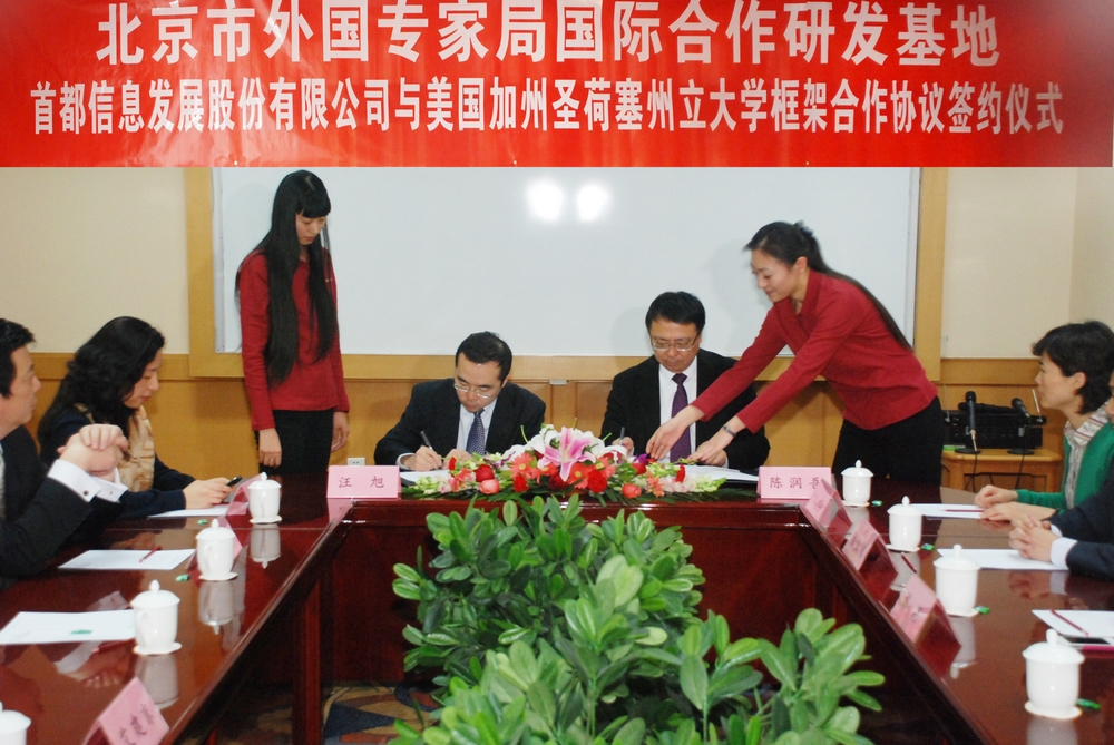 1月10日,“北京市外国专家局国际合作研发基地——首都信息发展股份有限公司与美国加州圣荷塞州立大学(SJSU)框架合作协议签约仪式”在北京市外国专家大厦隆重召开。市外专局程金刚主任主持签约仪式,市人保局副局长陈蓓到会祝贺并致辞。公司汪旭总裁与美国加州圣荷塞州立大学电子电机工程学系陈润吾主任代表合作双方在协议上签字。