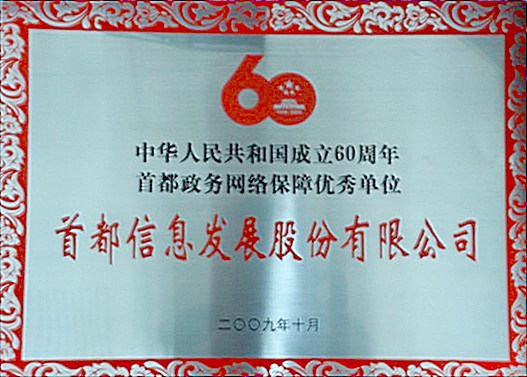 公司荣获由北京市电子政务网络管理中心颁发的“中华人民共和国成立60周年,首都政务网络保障优秀单位”奖牌,以表彰公司在国庆60周年庆祝活动保障工作中发挥的重要作用和做出的突出贡献。