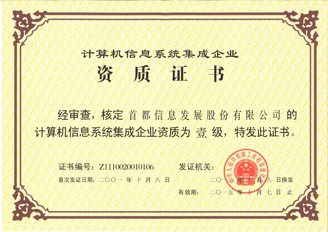 计算机信息系统集成资质是国家对计算机系统集成企业在集成方面整体实力的评定,是企业进入系统集成市场的钥匙。成功获得该项资质,不仅充分体现了首信公司作为“智慧北京”建设者在系统集成等方面的领先水平,同时也为公司进一步宣传行业品牌、赢得发展先机创造了条件,为把公司打造成全国领先的“智慧城市服务商”奠定了良好基础。