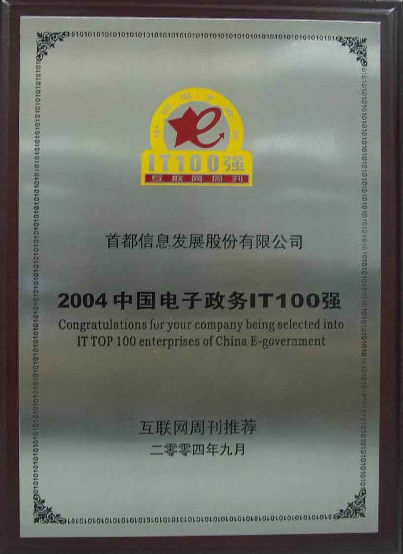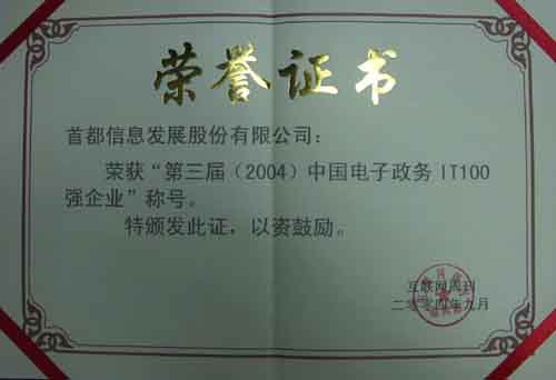 近日,公司被评为“2004’中国电子政务IT100强企业”第二十一名。中国电子政务IT100强企业评选活动由《互联网周刊》主办,此次共有2000多家企业参加评选。该项评选活动至今已历时三届,在前两届评选中,公司分获第十九名和第二十五名。