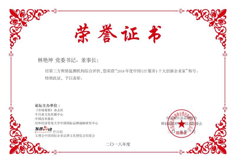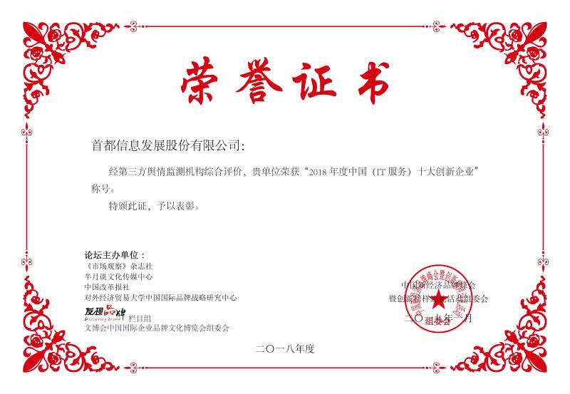 为深入总结我国经济发展在质量变革、品牌变革、效率变革、动力变革方面取得的成绩和经验,不断提升、增强我国经济创新力和品牌竞争力,1月13日,由国务院国资委《市场观察》杂志社、中宣部《半月谈》杂志社、中国改革报社、对外经济贸易大学中国国际品牌战略研究中心、发现品牌栏目组等机构联合主办的“2019中国新经济品牌峰会暨创新榜样巡礼活动”(以下简称“活动”)在人民日报社举行。会上,经第三方测评机构全网舆情监测分析评价,活动专家委员会审定,发布《2018中国新经济发展与创新成果舆情监测评价报告》,并推举出在发展新经济、培育新动能,建立新企业、运用新技术、制造新产品、开创新模式、拓展新市场方面取得丰硕成果的优秀创新代表,首都信息和首都信息董事长林艳坤被大会授予2018年度中国(IT服务)“十大创新企业”和“十大创新企业家”称号。
