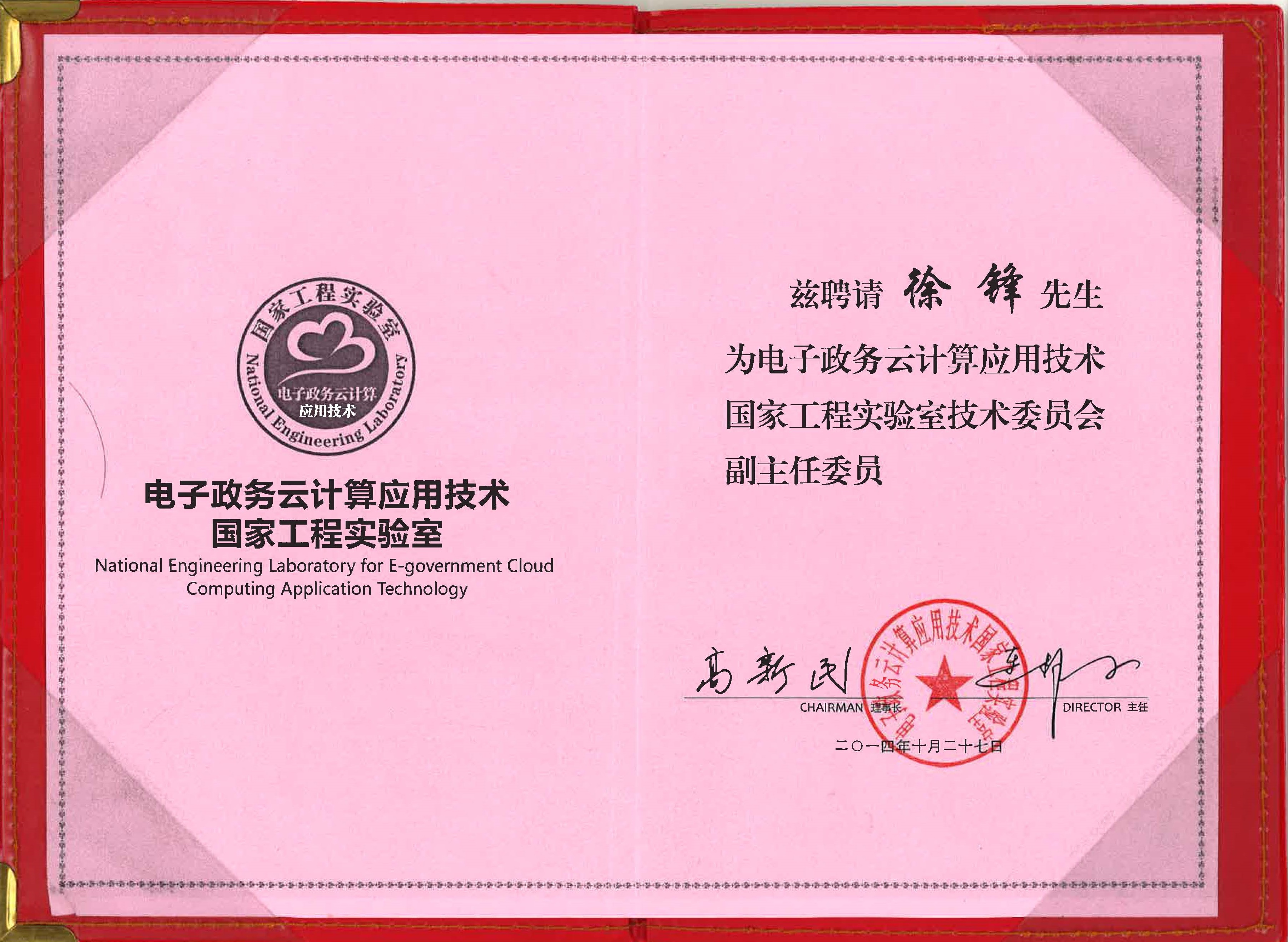 首信公司徐锋同志被聘为电子政务云计算应用技术国家工程实验室副主任委员