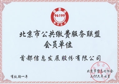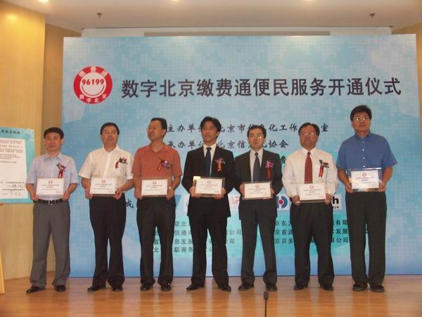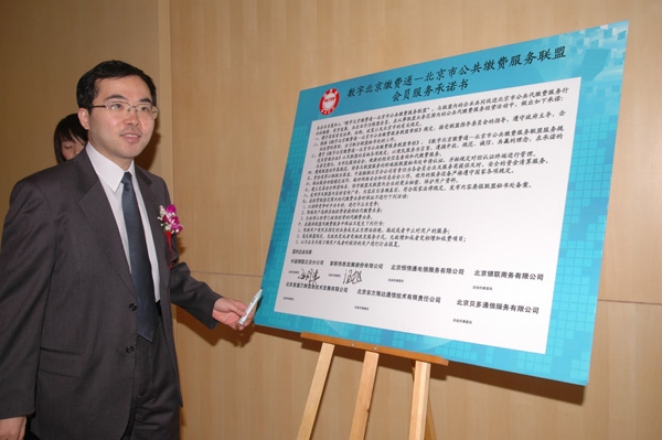 7月6日,北京市公共缴费服务联盟(数字北京缴费通)成立发布会暨会员签约仪式在海淀区社区服务中心所在地举行。北京市信息化工作办公室李洪副主任、公共信息管理处吴钢华处长,北京市发展和改革委员会,北京市民政局,北京市商务局,北京市市政管理委员会等单位领导出席签约仪式。汪旭总裁代表公司在《北京市公共缴费服务联盟会员服务承诺书》上签字。作为北京市公共缴费服务联盟的首批成员,公司承担了北京市公共缴费服务中的网上缴费服务。