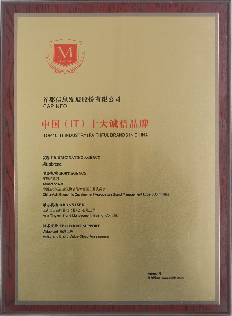 近日,由亚洲品牌网、中国亚洲经济发展协会品牌管理专业委员会联合主办的“2019一带一路品牌强国创新论坛”在京召开,论坛对2018年在品牌建设、品牌服务和品牌管理上取得优异成绩的企业予以了表彰。北京市属国企北京市国有资产经营有限责任公司(以下简称:北京国资公司)旗下的首都信息发展股份有限公司(以下简称:首都信息)凭借二十多年来在“数字北京”和“智慧北京”建设中,树立的企业品牌,荣获“中国(IT)十大诚信品牌”奖项。