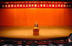 元月23日,首信公司新春联谊会在世纪剧院隆重召开。此次联谊会主题为"庆祝首信公司成立五周年暨2002年度工作总结大会"。大会由公司总裁汪旭主持,董事长陈信祥、公司决策层、管理层及各级员工共500余人参加了此次大会。