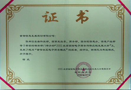12月15~17日,公司在北京国际会议中心参加“2005北京国际电子商务与供应链发展大会暨展览会”展示北京市电子商务与现代物流示范工程——社区电子商务等系统。会议期间,公司“首信社区电子商务模式”被大会组委会评为“典型模式”,并颁发荣誉证书及奖杯。