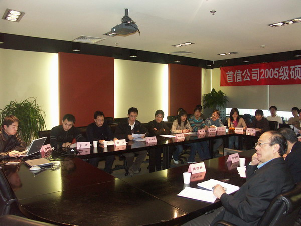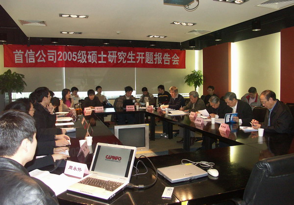 1月17日,公司与北京工业大学联合培养的2005级实习研究生开题报告会在大运村总部第一会议室举行。主持人为北京工业大学周小兵老师。公司陆首群名誉董事长、陈信祥董事长、北京软件行业协会华平澜会长和北京市网络多媒体实验室庄梓新副主任作为研究生导师,听取十名研究生的课题进展情况汇报,指导研究生确定课题研究方向,以提高课题的应用性和可操作性,为课题的顺利开展奠定基础。