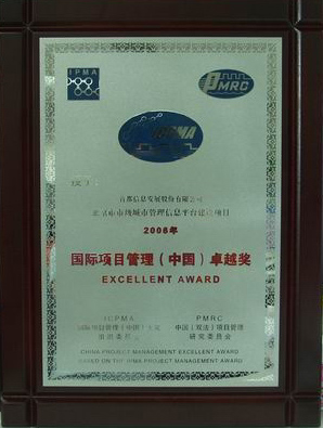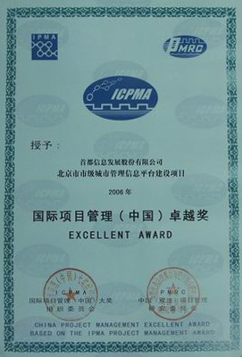 “国际项目管理(中国)大奖”设项目管理金奖、卓越奖和优秀奖三个奖项,在本届评选活动中,金奖空缺,北京市市级城市管理信息平台建设项目为荣获“国际项目管理(中国)卓越奖”的三个项目之一。此荣誉的获得表明公司具备了经国际项目管理协会(IPMA)和PMRC评估认定的国际项目管理能力和水平。